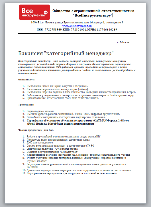 С 2023 года обучение в 4Retail Business School является преимуществом при устройстве на работу категорийным менеджером в компанию "Все Инструменты"